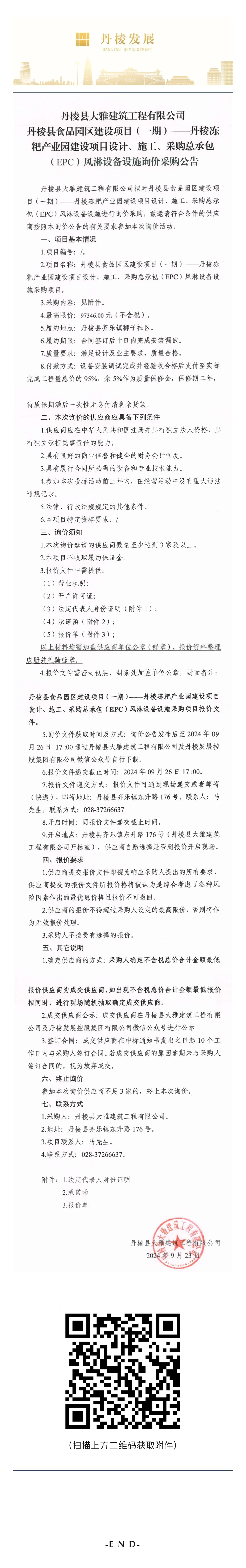 縣大雅建筑公司丹棱縣食品園區(qū)建設(shè)項目(一期)—丹棱凍粑產(chǎn)業(yè)園建設(shè)項目設(shè)計、施工、采購總承包(EPC)風(fēng)淋設(shè)備設(shè)施詢價采購公告