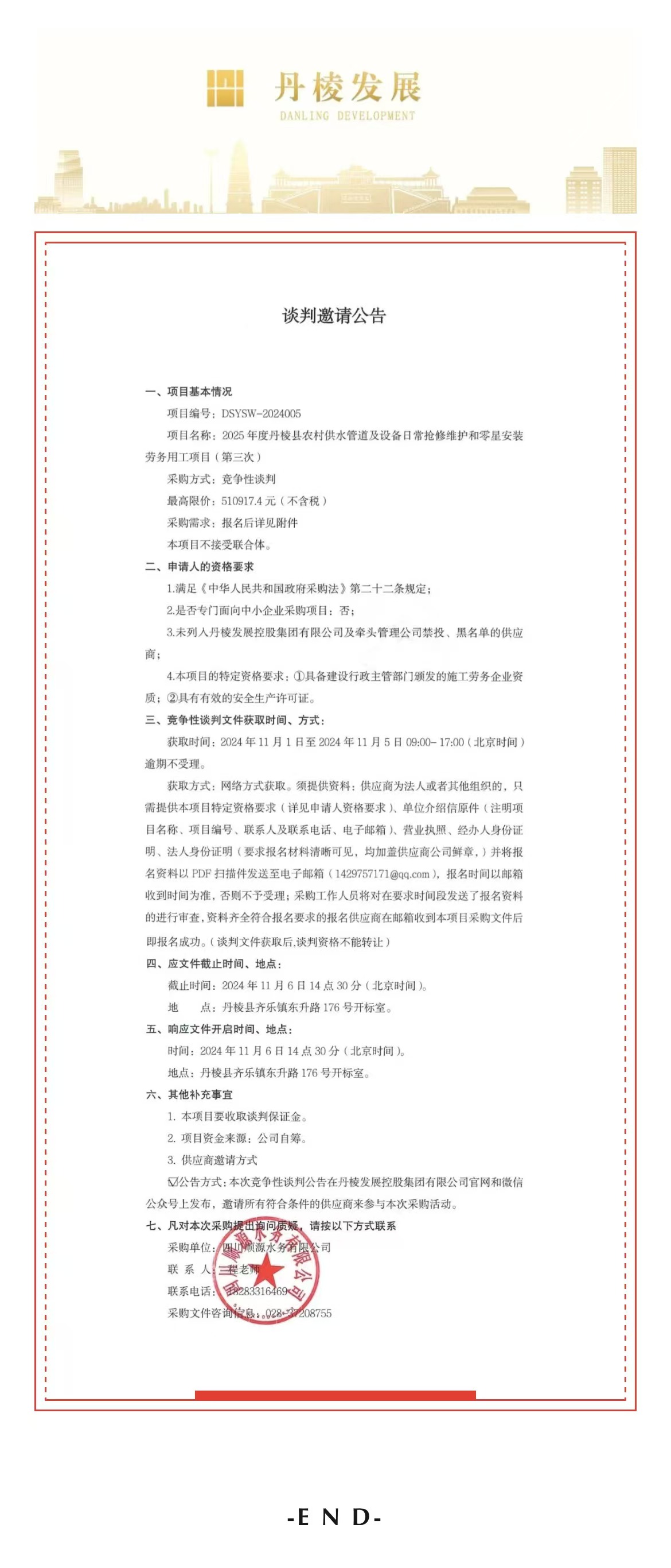2025年度丹棱縣農(nóng)村供水管道及設(shè)備日常搶修維護和零星安裝勞務(wù)用工項目(第三次)談判邀請公告