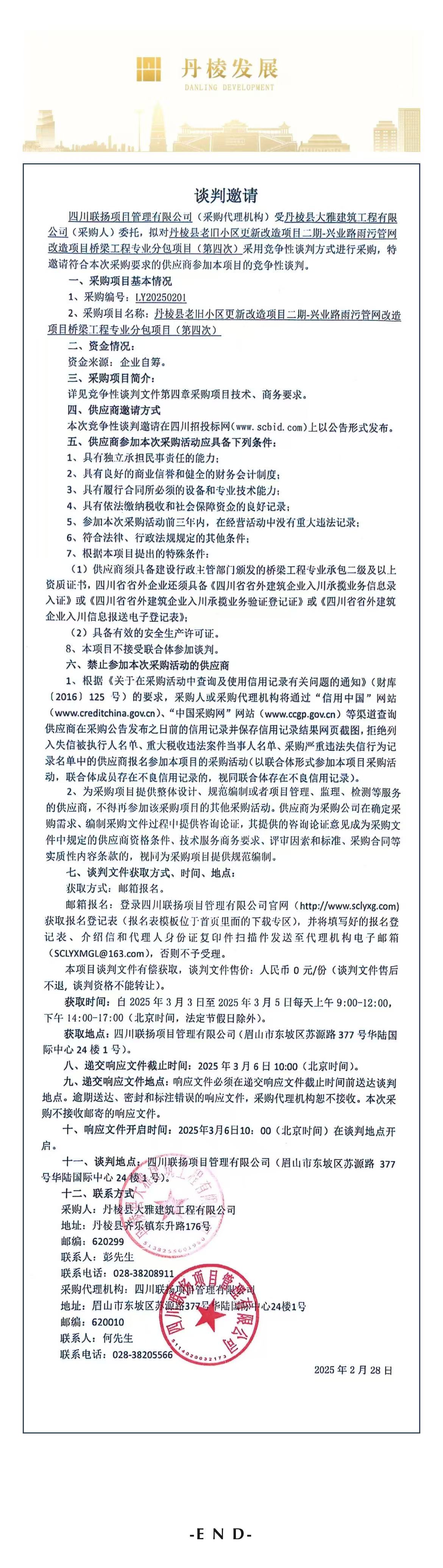丹棱縣老舊小區(qū)更新改造項(xiàng)目二期-興業(yè)路雨污管網(wǎng)改造項(xiàng)目橋梁工程專(zhuān)業(yè)分包項(xiàng)目談判邀請(qǐng)公告(第四次)