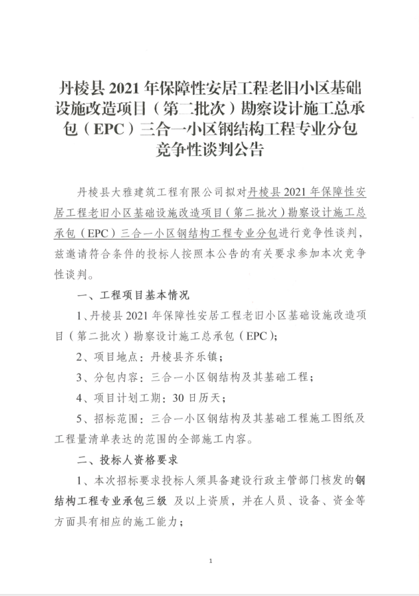 【大雅建筑公司】丹棱縣2021年保障性安居工程老舊小區(qū)基礎(chǔ)設(shè)施改造項(xiàng)目(第二批次)勘察設(shè)計(jì)施工總承包(EPC)三合一小區(qū)鋼結(jié)構(gòu)工程專業(yè)分包競(jìng)爭(zhēng)性談判公告