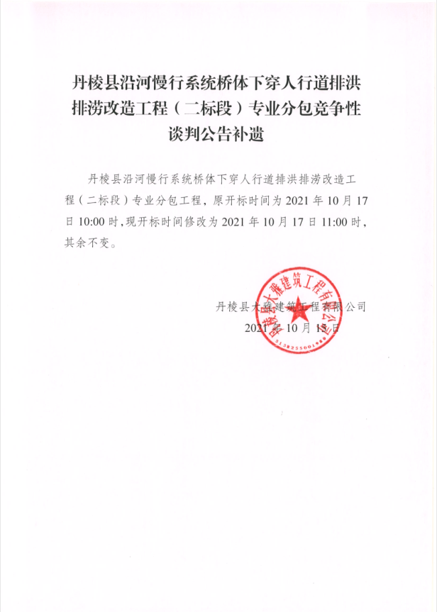 【大雅建筑公司】丹棱縣沿河慢行系統(tǒng)橋體下穿人行道排洪排澇改造工程(二標(biāo)段)專業(yè)分包競爭性談判公告補遺