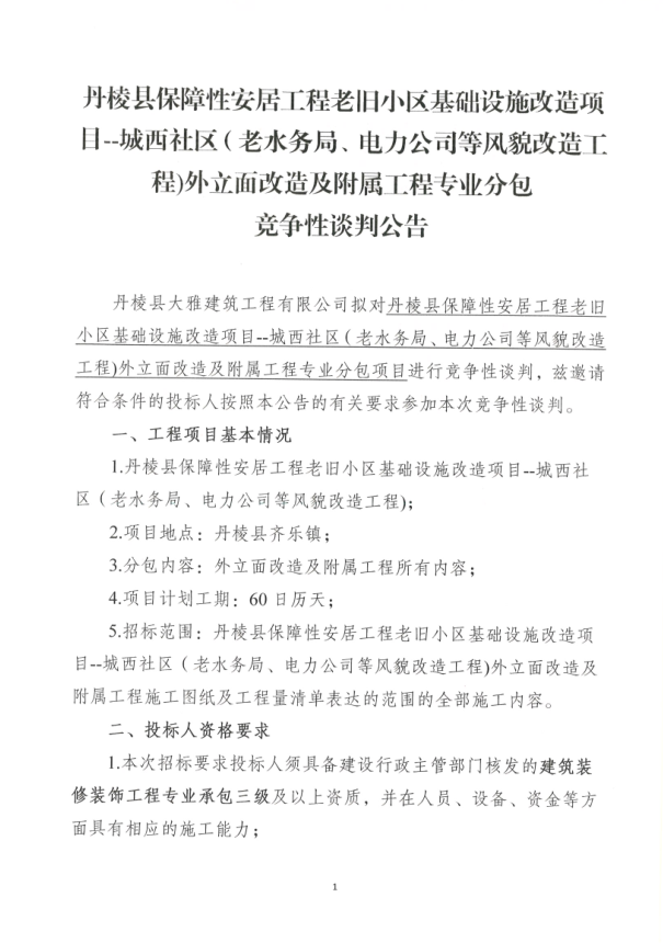 【大雅建筑公司】丹棱縣保障性安居工程老舊小區(qū)基礎(chǔ)設(shè)施改造項目--城西社區(qū)(老水務局、電力公司等風貌改造工程)外立面改造及附屬工程專業(yè)分包競爭性談判公告