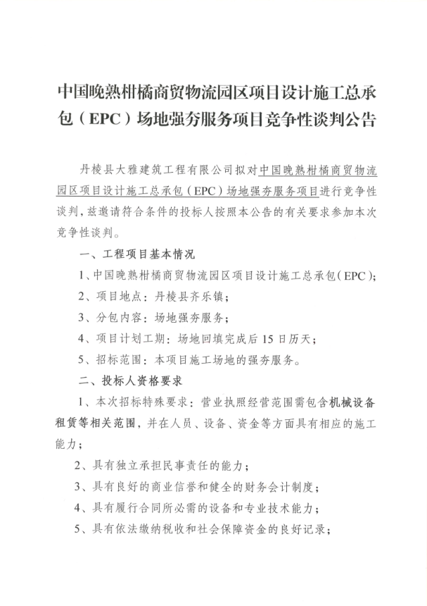 【大雅建筑公司】中國晚熟柑橘商貿物流園區(qū)項目設計施工總承包(EPC)場地強夯服務項目競爭性談判公告