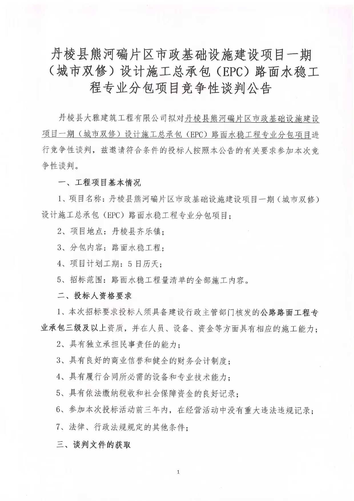丹棱縣熊河碥片區(qū)市政基礎(chǔ)設(shè)施建設(shè)項(xiàng)目一期(城市雙修)設(shè)計施工總承包(EPC)路面水穩(wěn)工 程專業(yè)分包項(xiàng)目競爭性談判公告
