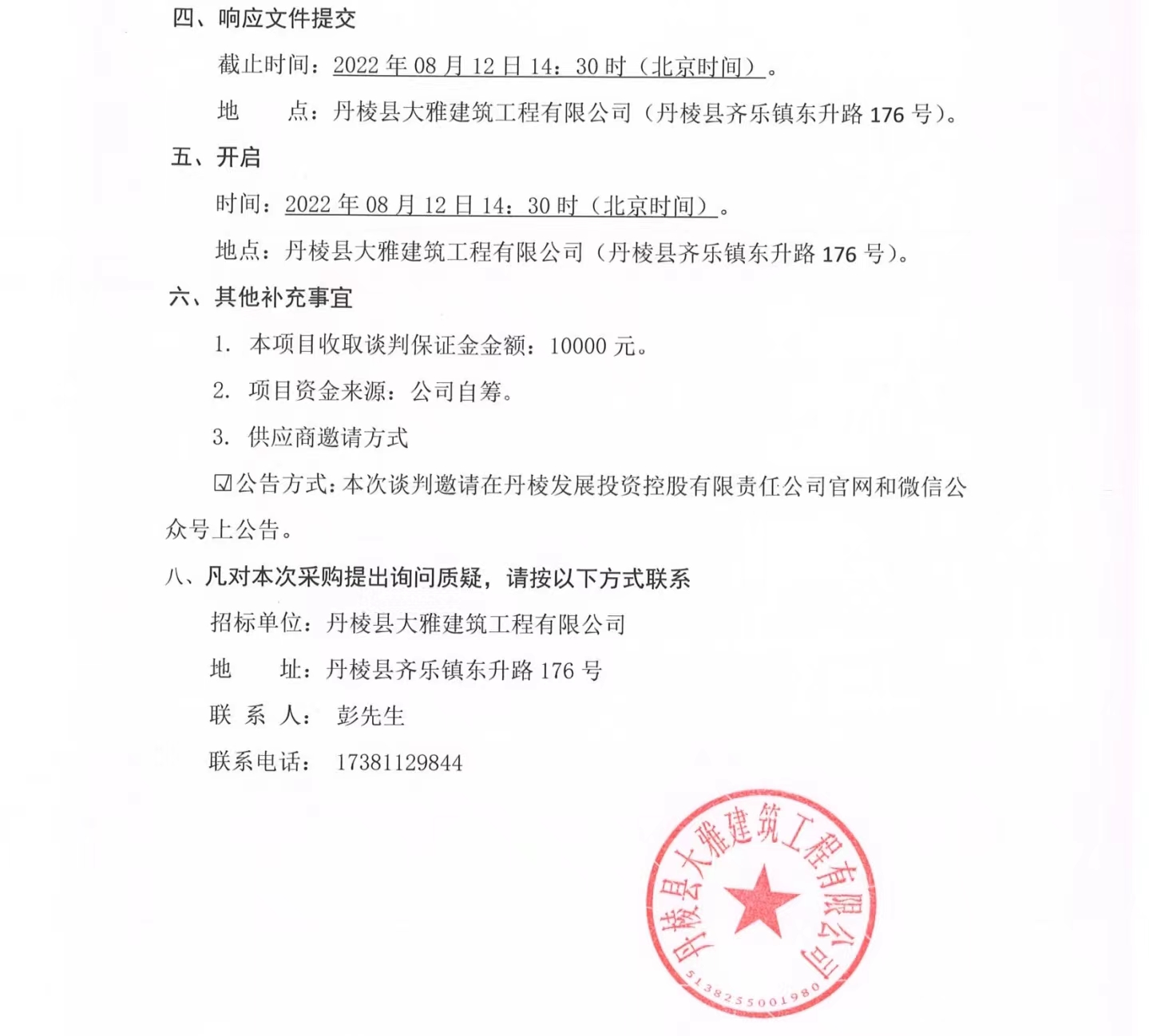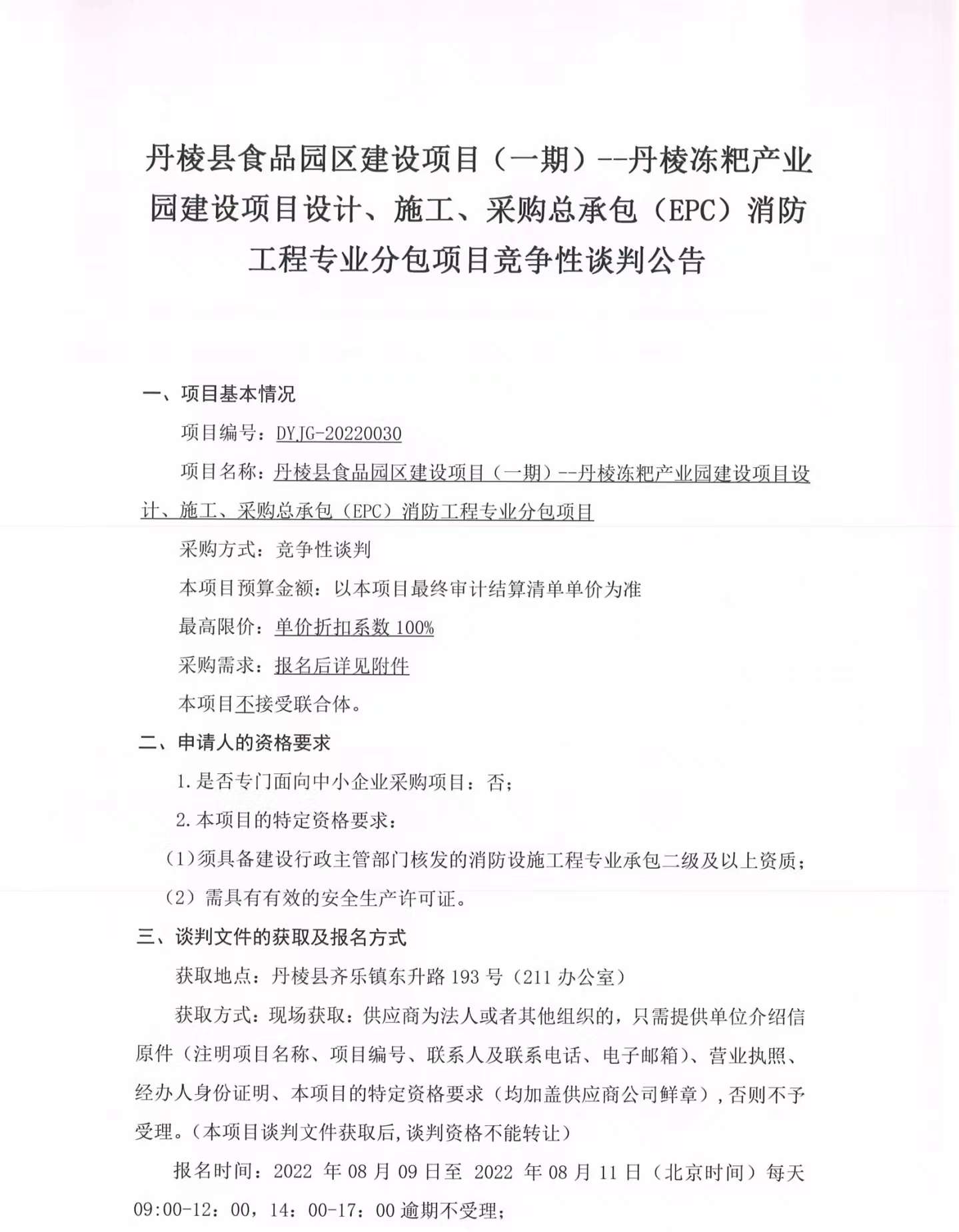 丹棱縣食品園區(qū)建設(shè)項(xiàng)目(一期)--丹棱凍粑產(chǎn)業(yè)園建設(shè)項(xiàng)目設(shè)計(jì)、施工、采購(gòu)總承包(EPC)消防工程專(zhuān)業(yè)分包項(xiàng)目競(jìng)爭(zhēng)性談判公告