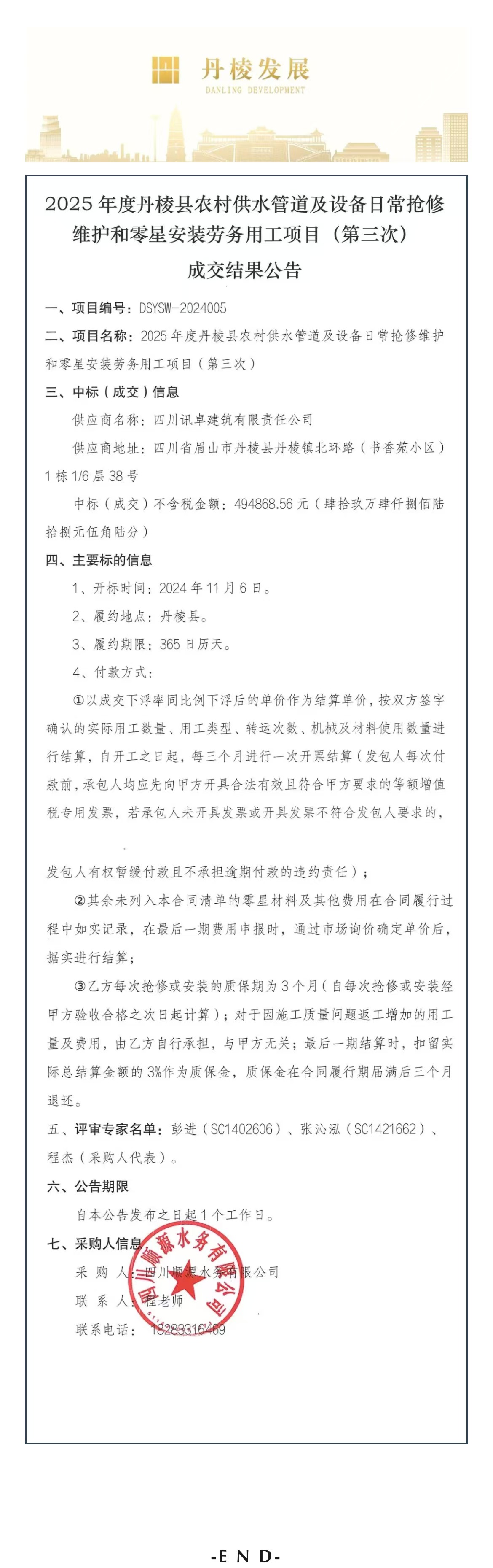 2025年度丹棱縣農(nóng)村供水管道及設備日常搶修維護和零星安裝勞務用工項目(第三次)成交結果公告