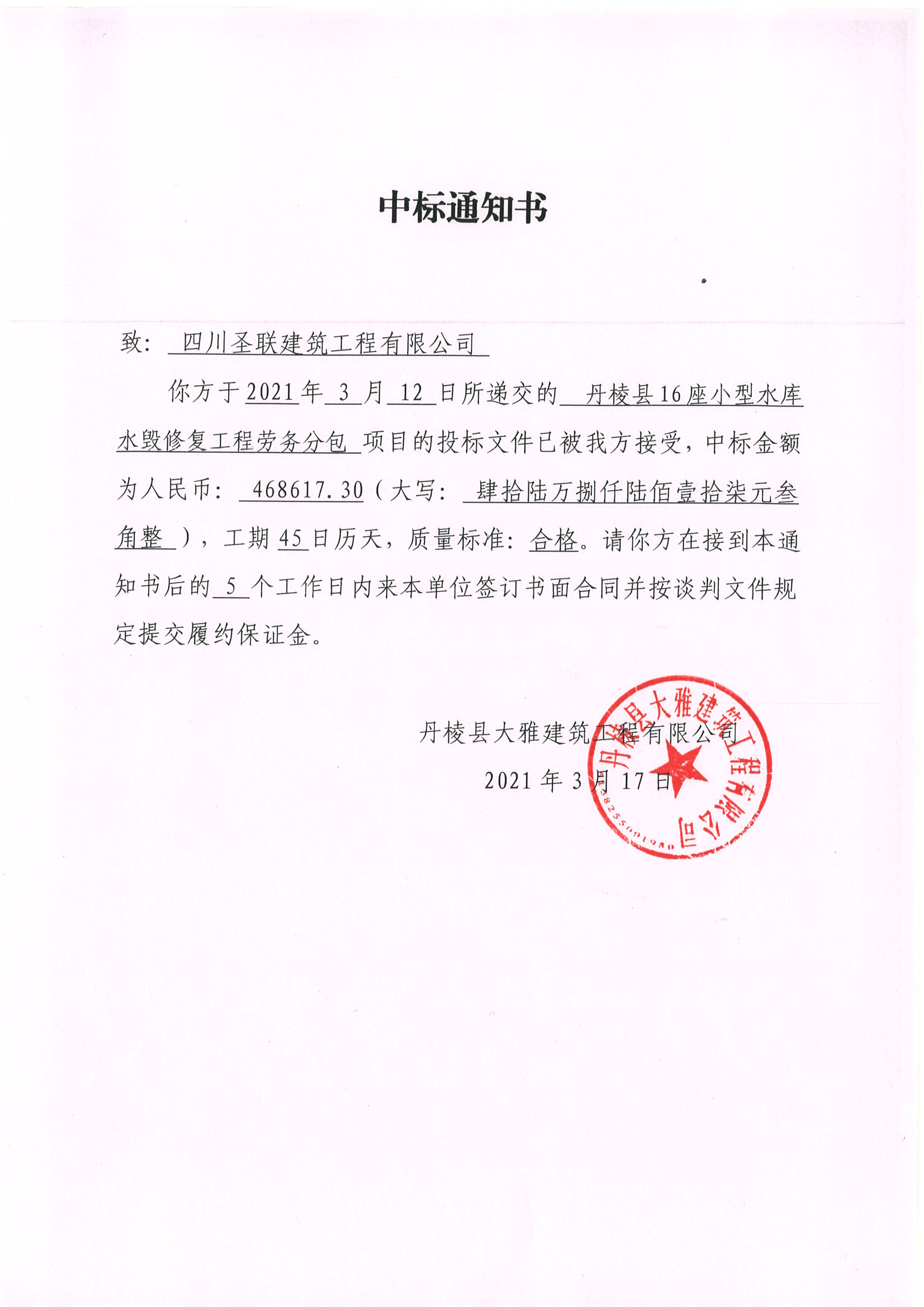 【大雅建筑公司】丹棱縣16座小型水庫水毀修復工程勞務(wù)分包中標成交公告