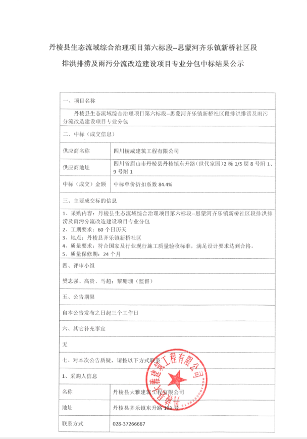 【大雅建筑公司】丹棱縣生態(tài)流域綜合治理項目第六標段—思蒙河齊樂鎮(zhèn)新橋社區(qū)段排洪排澇及雨污分流改造建設(shè)項目專業(yè)分包中標結(jié)果公示