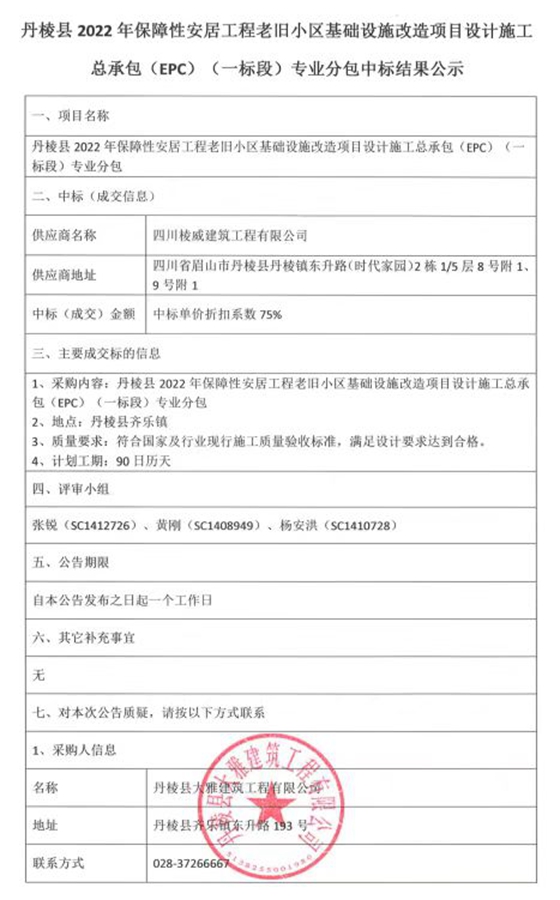 丹棱縣2022年保障性安居工程老舊小區(qū)基礎(chǔ)設(shè)施改造項(xiàng)目設(shè)計(jì)施工總承包(EPC)(一標(biāo)段)專業(yè)分包中標(biāo)結(jié)果公示