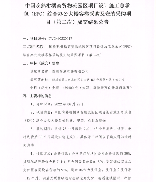 中國晚熟柑橘商貿(mào)物流園區(qū)項目設計施工總承包(EPC)綜合辦公大樓客梯采購及安裝采購項目(第二次)成交結(jié)果公告