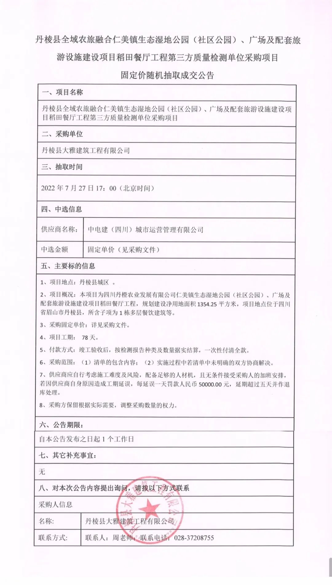 仁美鎮(zhèn)生態(tài)濕地公園(社區(qū)公園)、廣場及配套旅游設(shè)施建設(shè)項目稻田餐廳工程第三方質(zhì)量檢測單位采購項目固定價隨機(jī)抽取成交公告