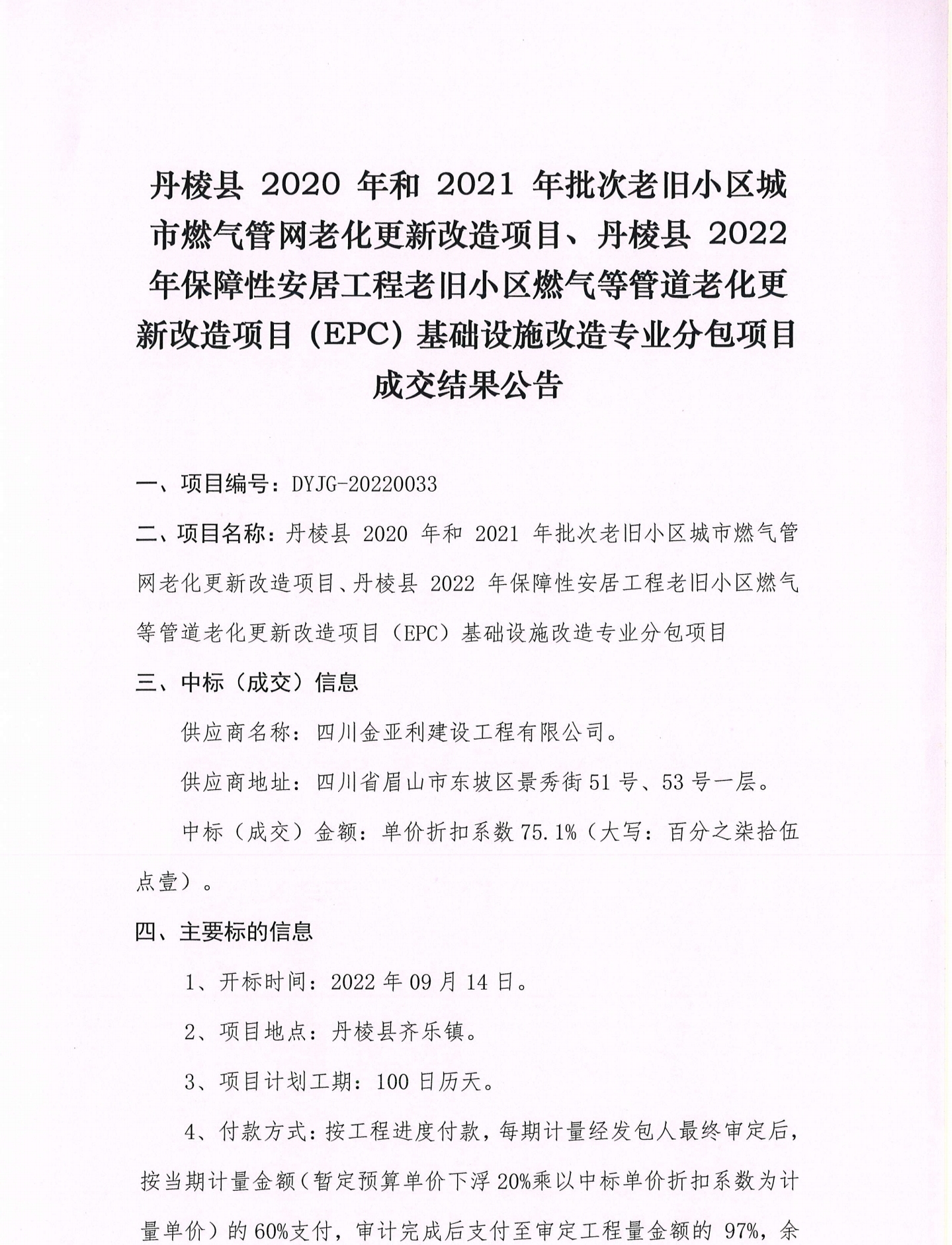 丹棱縣2020年和2021年批次老舊小區(qū)城市燃?xì)夤芫W(wǎng)老化更新改造項目、丹棱縣2022年保障性安居工程老舊小區(qū)燃?xì)獾裙艿览匣赂脑祉椖?EPC)基礎(chǔ)設(shè)施改造專業(yè)分包項目 成交結(jié)果公告