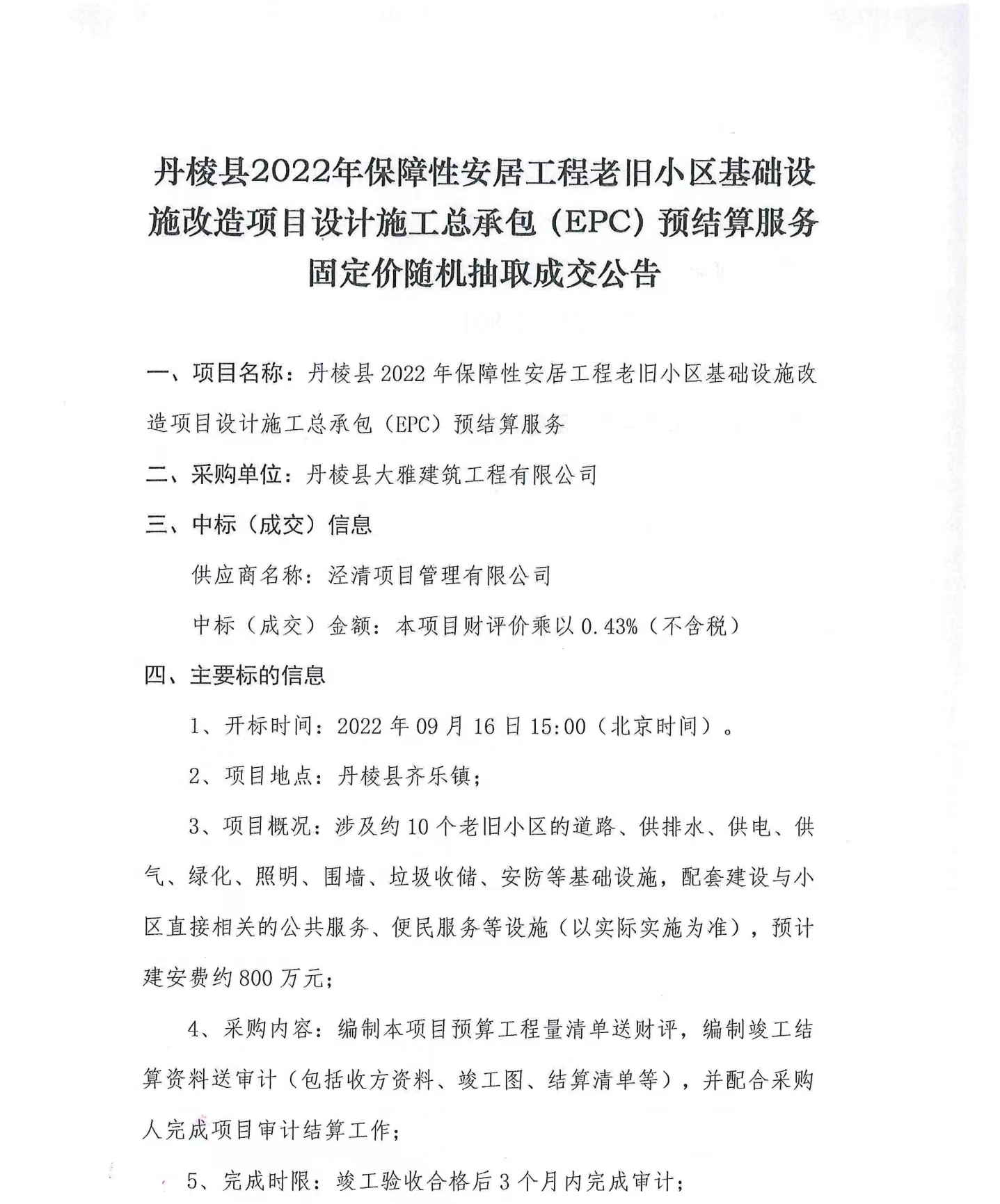 丹棱縣2022年保障性安居工程老舊小區(qū)基礎(chǔ)設(shè)施改造項目設(shè)計施工總承包(EPC)預(yù)結(jié)算服務(wù)固定價隨機抽取成交公告