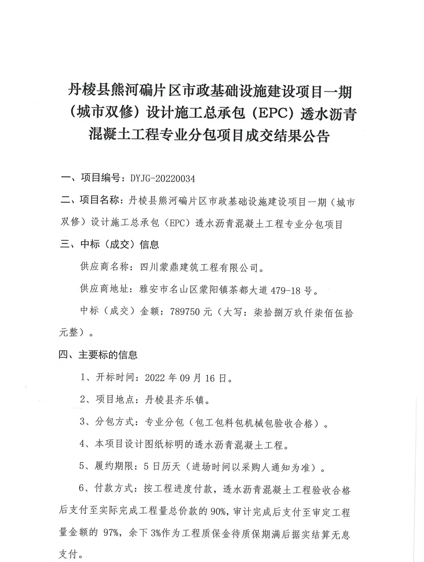 丹棱縣熊河碥片區(qū)市政基礎設施建設項目一期(城市雙修)設計施工總承包(EPC)透水瀝青混凝土工程專業(yè)分包項目成交結(jié)果公告