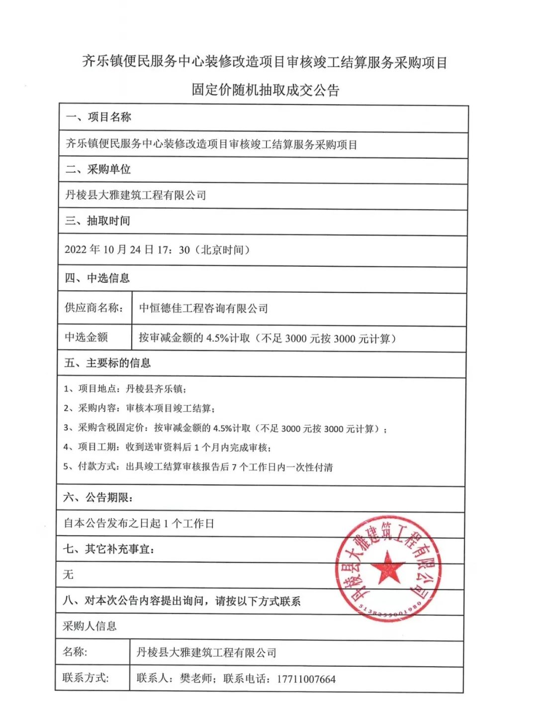 齊樂鎮(zhèn)便民服務(wù)中心裝修改造項(xiàng)目審核竣工結(jié)算服務(wù)采購(gòu)項(xiàng)目固定價(jià)隨機(jī)抽取成交公告