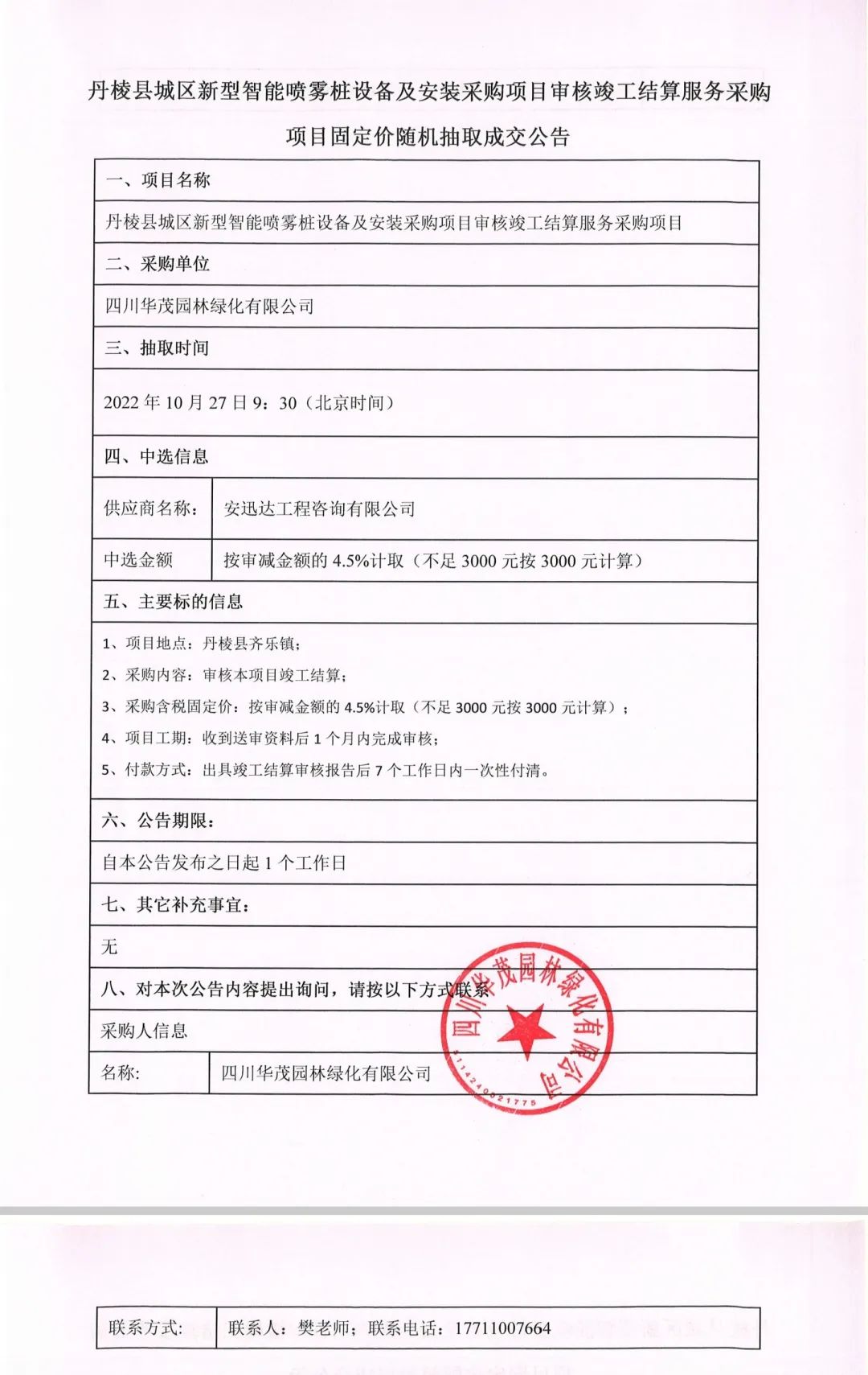 丹棱縣城區(qū)新型智能噴霧樁設(shè)備及安裝采購(gòu)項(xiàng)目審核竣工結(jié)算服務(wù)采購(gòu)項(xiàng)目固定價(jià)隨機(jī)抽取成交公告