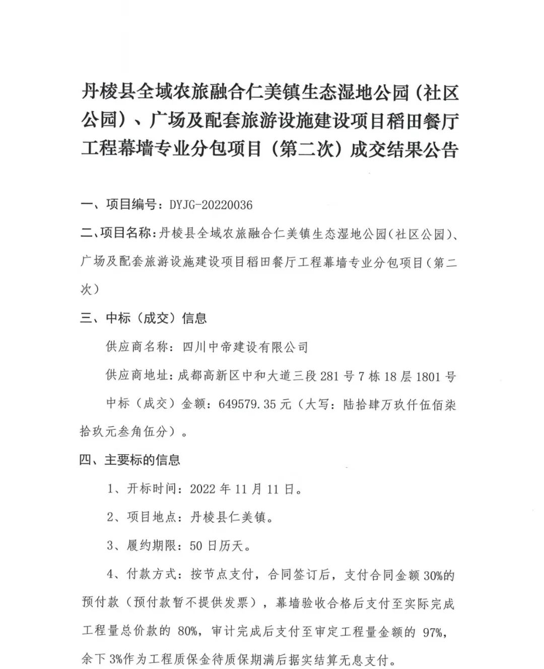 丹棱縣全域農(nóng)旅融合仁美鎮(zhèn)生態(tài)濕地公園(社區(qū)公園)、廣場及配套旅游設施建設項目稻田餐廳工程幕墻專業(yè)分包(第二次)成交結果公告