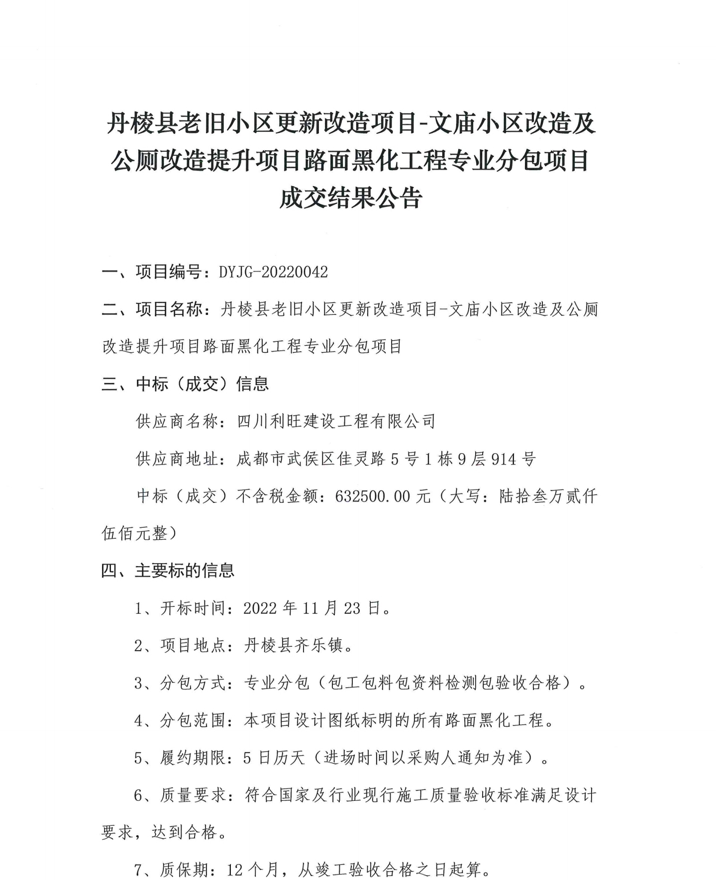 丹棱縣老舊小區(qū)更新改造項(xiàng)目-文廟小區(qū)改造及公廁改造提升項(xiàng)目路面黑化工程專(zhuān)業(yè)分包項(xiàng)目成交結(jié)果公告