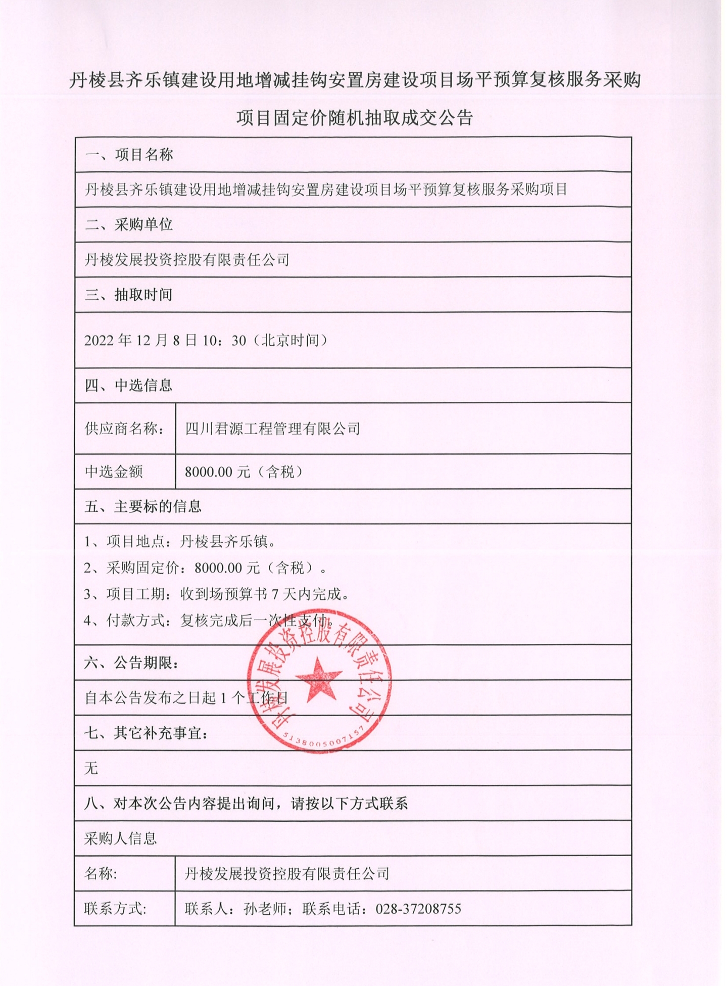 丹棱縣齊樂鎮(zhèn)建設(shè)用地增減掛鉤安置房建設(shè)項(xiàng)目場(chǎng)平預(yù)算復(fù)核服務(wù)采購(gòu)項(xiàng)目固定價(jià)隨機(jī)抽取成交公告