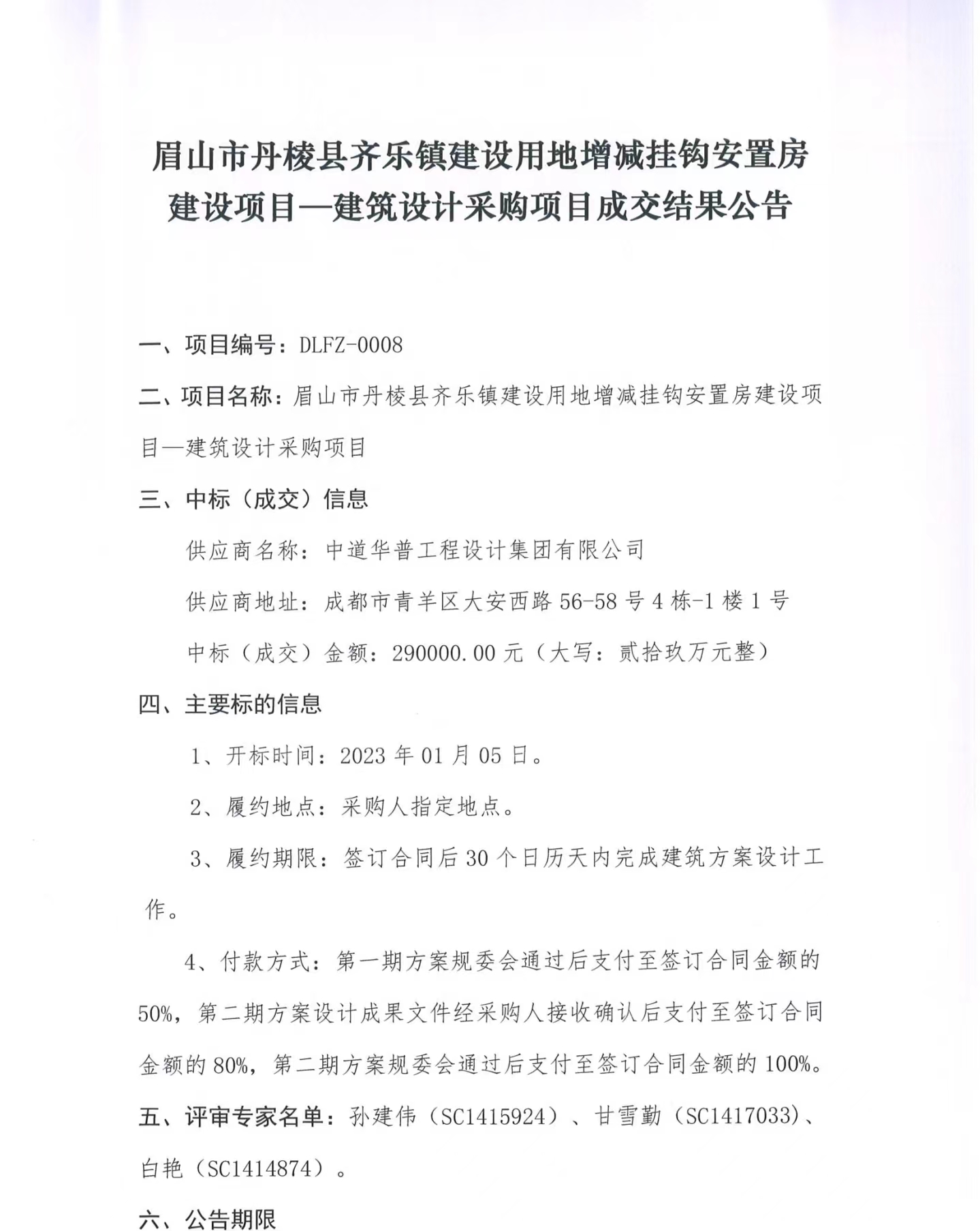 眉山市丹棱縣齊樂鎮(zhèn)建設(shè)用地增減掛鉤安置房建設(shè)項目--建筑設(shè)計采購項目成交結(jié)果公告