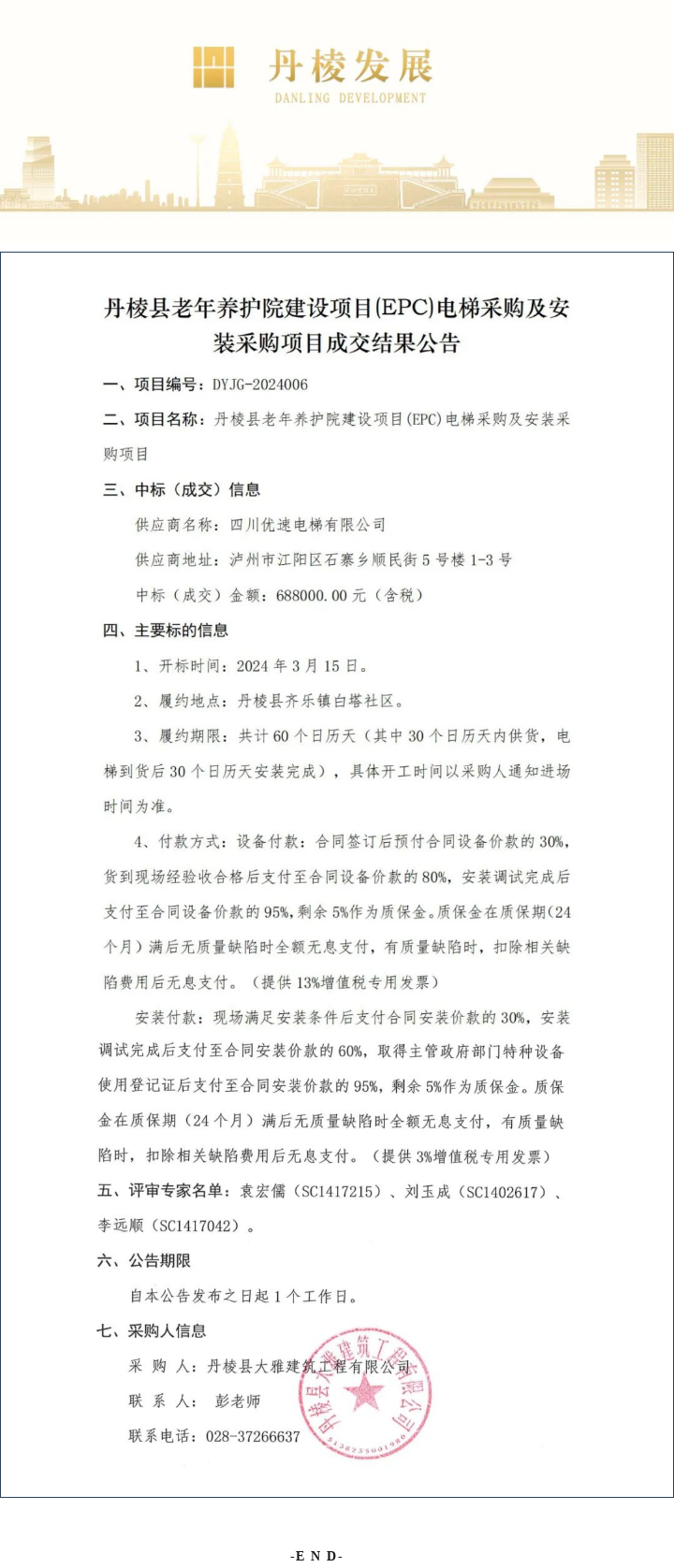 丹棱縣老年養(yǎng)護(hù)院建設(shè)項(xiàng)目(EPC)電梯采購及安裝采購項(xiàng)目成交結(jié)果公告