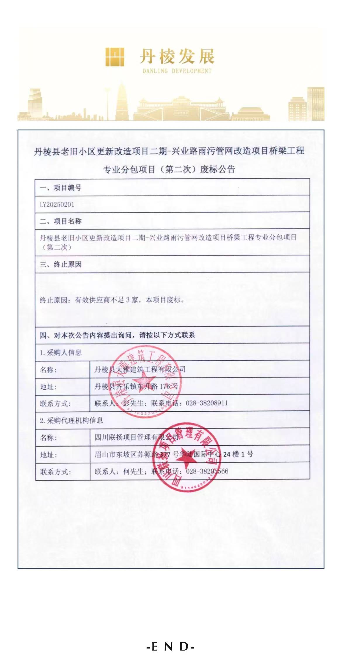 丹棱縣老舊小區(qū)更新改造項目二期-興業(yè)路雨污管網(wǎng)改造項目橋梁工程專業(yè)分包項目(第二次)廢標(biāo)公告