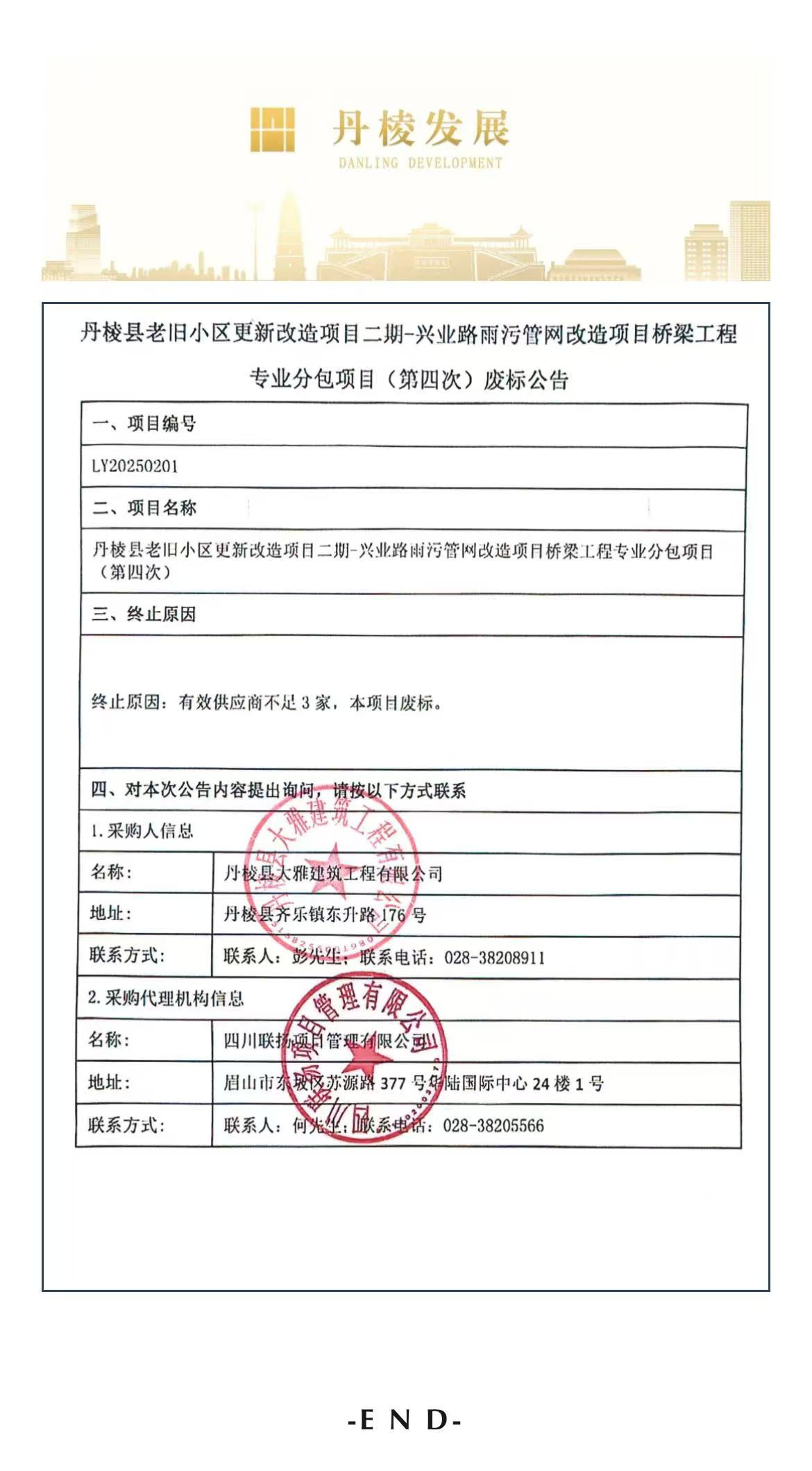 丹棱縣老舊小區(qū)更新改造項目二期-興業(yè)路雨污管網(wǎng)改造項目橋梁工程專業(yè)分包項目(第四次)廢標(biāo)公告