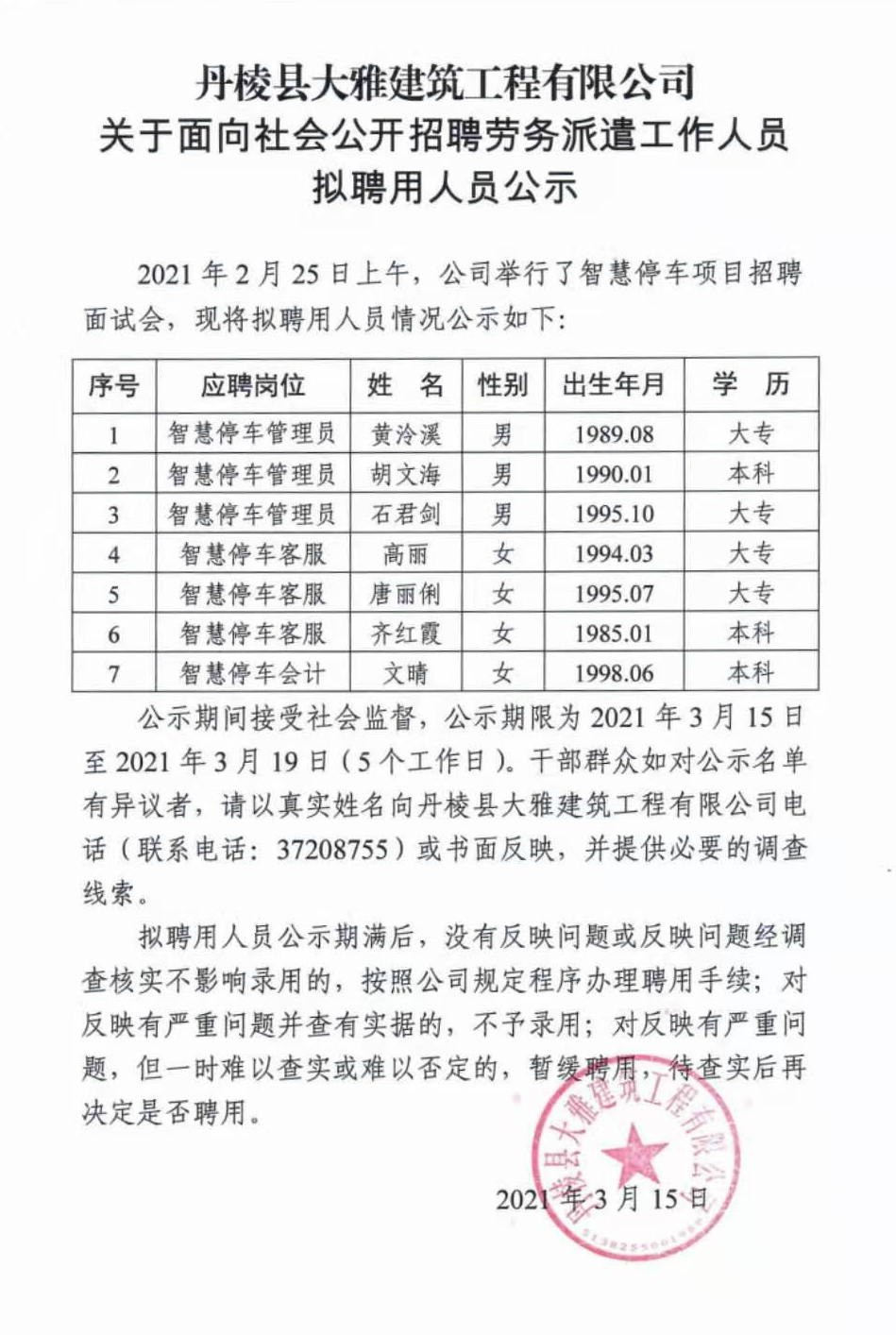 【大雅建筑公司】關(guān)于面向社會公開招聘勞務(wù)派遣工作人員擬聘用人員公示