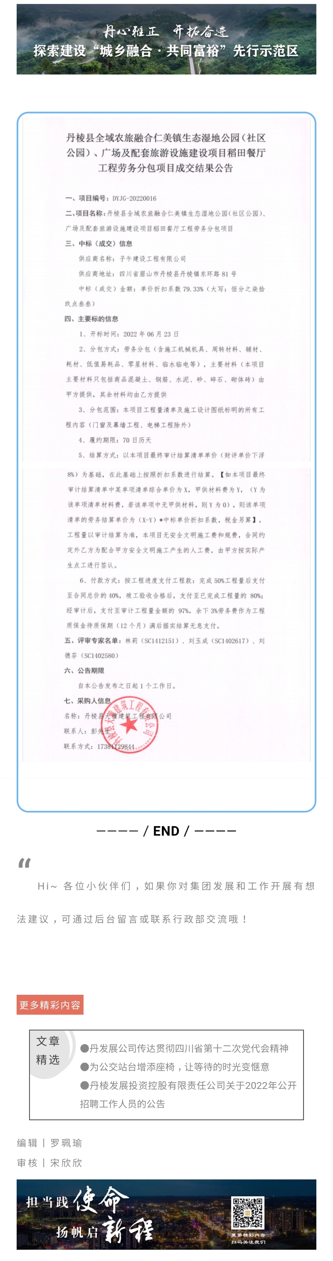 丹棱縣全域農(nóng)旅融合仁美鎮(zhèn)生態(tài)濕地公園(社區(qū)公園)、廣場及配套旅游設(shè)施建設(shè)項目稻田餐廳工程勞務(wù)分包項目成交結(jié)果公告