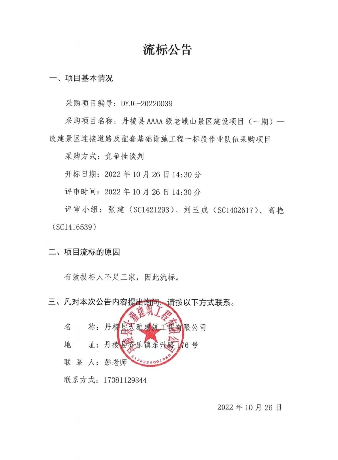丹棱縣AAAA級老峨山景區(qū)建設(shè)項目(一期)--改建景區(qū)連接道路及配套基礎(chǔ)設(shè)施工程一標(biāo)段作業(yè)隊伍采購項目流標(biāo)公告