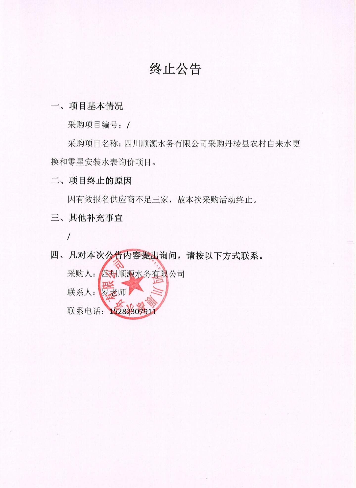 四川順源水務有限公司采購丹棱縣農(nóng)村自來水更換和零星安裝水表詢價項目終止公告