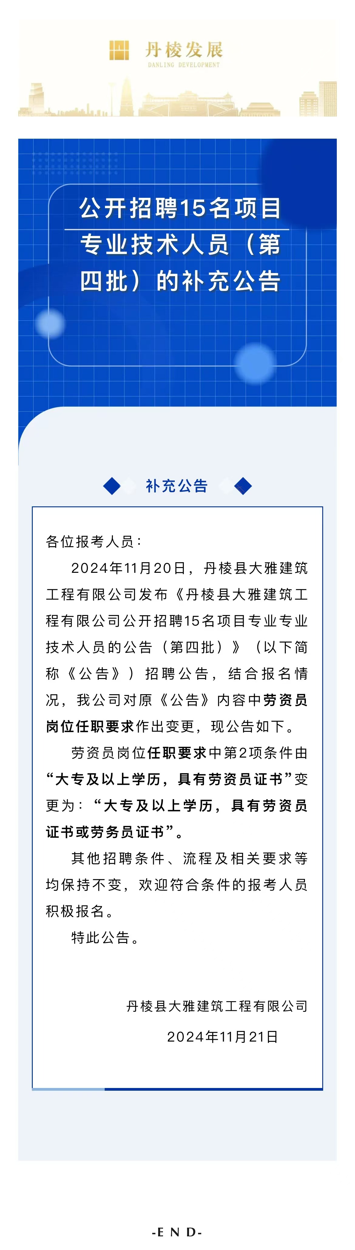 丹棱縣大雅建筑工程有限公司關(guān)于公開(kāi)招聘15名項(xiàng)目專(zhuān)業(yè)技術(shù)人員(第四批)的補(bǔ)充公告
