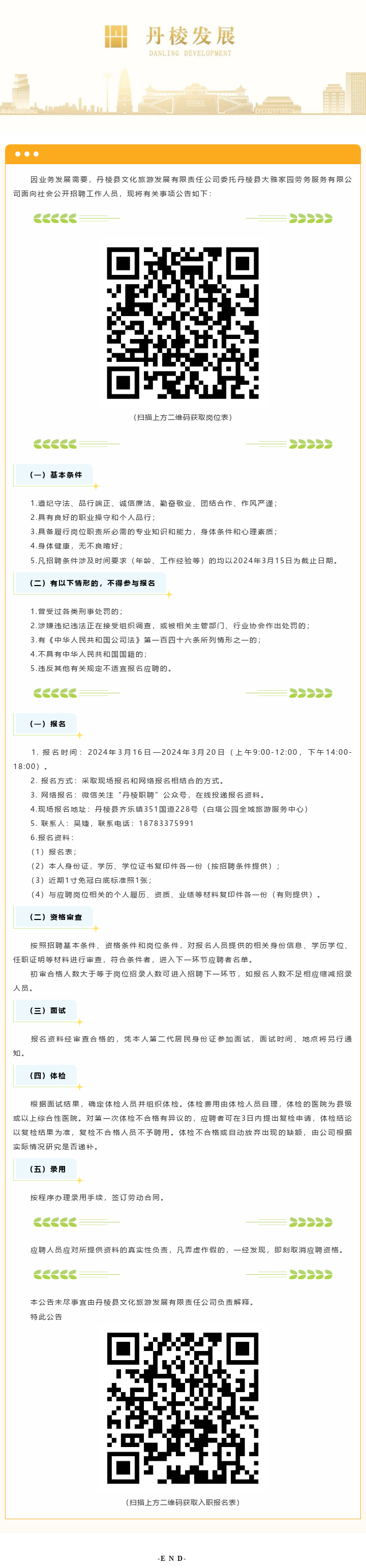 丹棱縣大雅家園勞務(wù)服務(wù)有限公司關(guān)于為丹棱縣文化旅游發(fā)展有限責(zé)任公司公開(kāi)招聘32名勞務(wù)派遣人員的公告