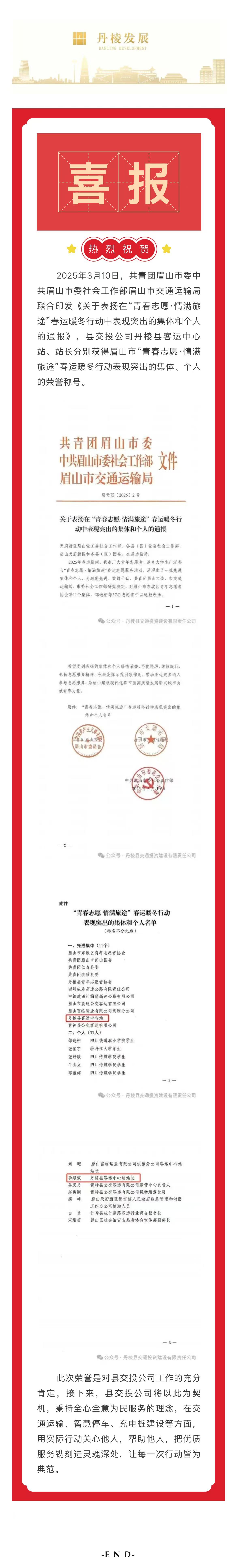 【縣交投公司】喜報(bào)!丹棱縣客運(yùn)中心站、站長(zhǎng)分別獲得眉山市“青春志愿·情滿旅途”春運(yùn)暖冬行動(dòng)表現(xiàn)突出的集體、個(gè)人榮譽(yù)稱(chēng)號(hào)
